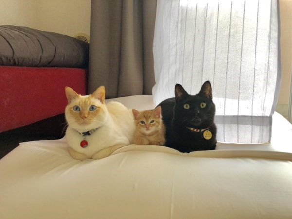 ▼「 イチそらあめ」的喵喵分別是9歲的白貓Ichi、3歲的黑貓Sora。2019年5月5日,家裡來了一位新成員,這隻出生沒多久的流浪小橘貓初來乍到,牠看起來非常不安,還緊張到身體瑟瑟發抖,當兩隻大貓靠近它的時候,牠會下意識的走開。