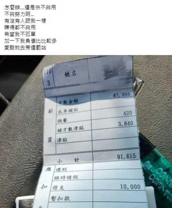 2023年12月08日月領9萬還喊窮,錢到底花到哪裡去了?最近一名男網友在臉書社團「爆怨公社」放上自己的薪水條,只見加上誤餐費等津貼,他一個月能領91,615元,扣掉預支的1萬元,還能領到81,615元。不過原po卻說:「怎麼辦!還是快不夠用,不夠努力啊!有沒有人跟我一樣?賺得都不夠用,希望我不孤單,加一下我負債比較多,愛酸就去旁邊罰站!」