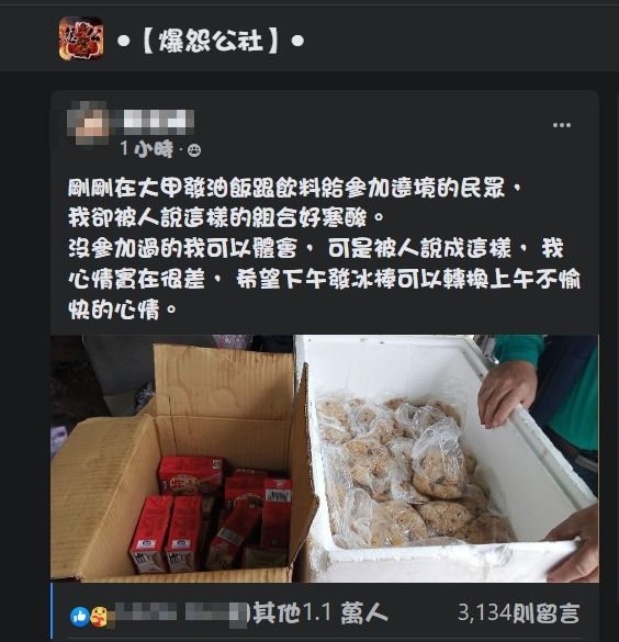 ▼這位網友在臉書社團「爆怨公社」發文說,他在台中市大甲區發油飯跟飲料給當地參加遶境的民眾,結果卻被人批評「這樣的組合好寒酸」。這讓他相當難過:「沒參加過的我可以體會,可是被人說成這樣,我心情實在很差,希望下午發冰棒可以轉換上午不愉快的心情。」