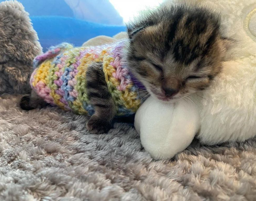 ▼小貓們剛剛出生就失去媽媽,牠們會本能地互相吸吮,這是非常不安全的。Penny為牠們穿上迷你毛衣,幫助牠們改掉這個習慣。