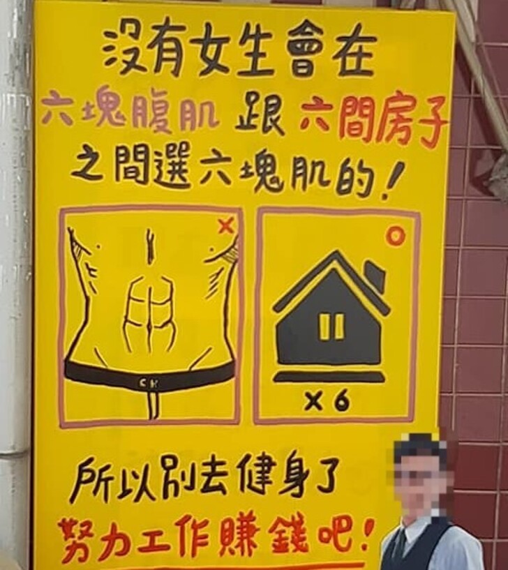 ▼從原po貼出的照片可以看到,海報上畫有「6塊肌」和「房子X6」,文案則是:「沒有女生會在『六塊腹肌』和『六間房子』之間選擇六塊肌的!所以別去健身了,努力工作賺錢吧!」