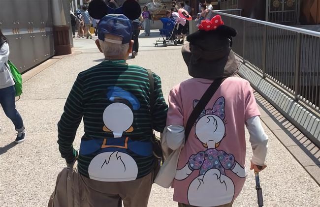 ▼這對爺爺奶奶已經年紀很大了,但他們充滿童心。爺爺穿著印有唐老鴨的長袖條紋T恤;旁邊的奶奶則穿著印有黛西的粉色T恤。這情侶裝跟迪士尼樂園的氣氛很搭,穿在他們身上格外有愛。