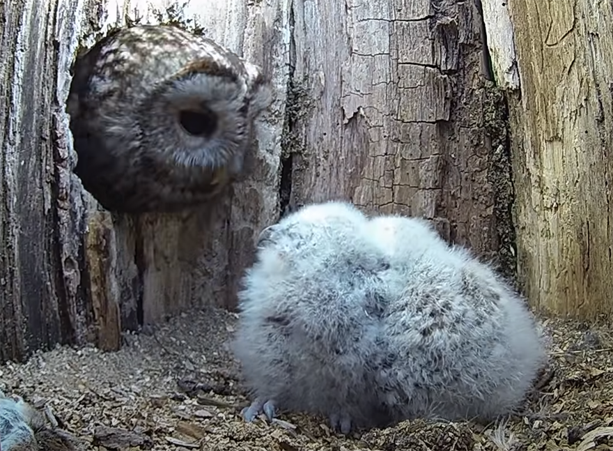 ▼當時2隻灰林鴞寶寶出現在Luna棲身的樹洞裡,牠們一看到Luna回來,就迫不及待發出激動的啾啾聲。Luna看到這2個莫名出現的小孩,瞬間母愛爆發,用翅膀將牠們蓋住,就像將牠們抱在懷裡一樣。Luna非常珍惜這2隻鳥寶,那母愛滿滿的畫面超感人。