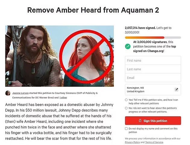 ▼隨著強尼戴普和安柏赫德的離婚官司越鬧越大,安柏赫德的形象也變得越來越糟。日前美國連署網站「Change.org」上出現了一個標題為「把安柏赫德踢出《水行俠2》」(Remove Amber Heard from Aquaman 2)的線上連署,截至目前已經有近300萬人連署,而且人數還在持續飆升中。