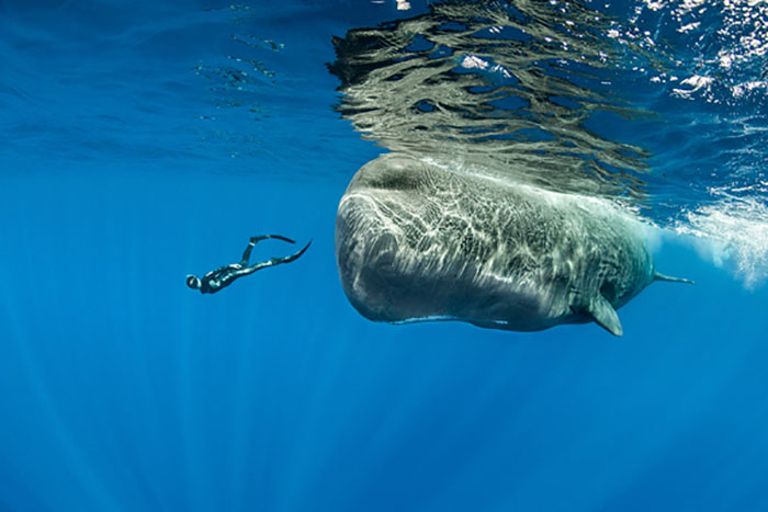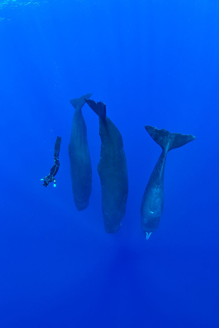 ▼專業的水下攝影師法蘭柯(Franco Banfi)拍下了抹香鯨們睡覺的樣子,牠們會突然同步停止游動,並以垂直的狀態休息。