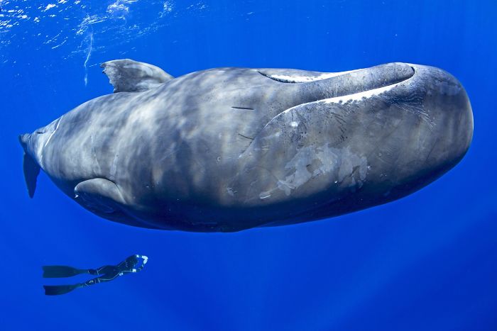 ▼科學家與潛水攝影師們也是利用這個短暫的空擋,觀察了抹香鯨的睡眠情形。
