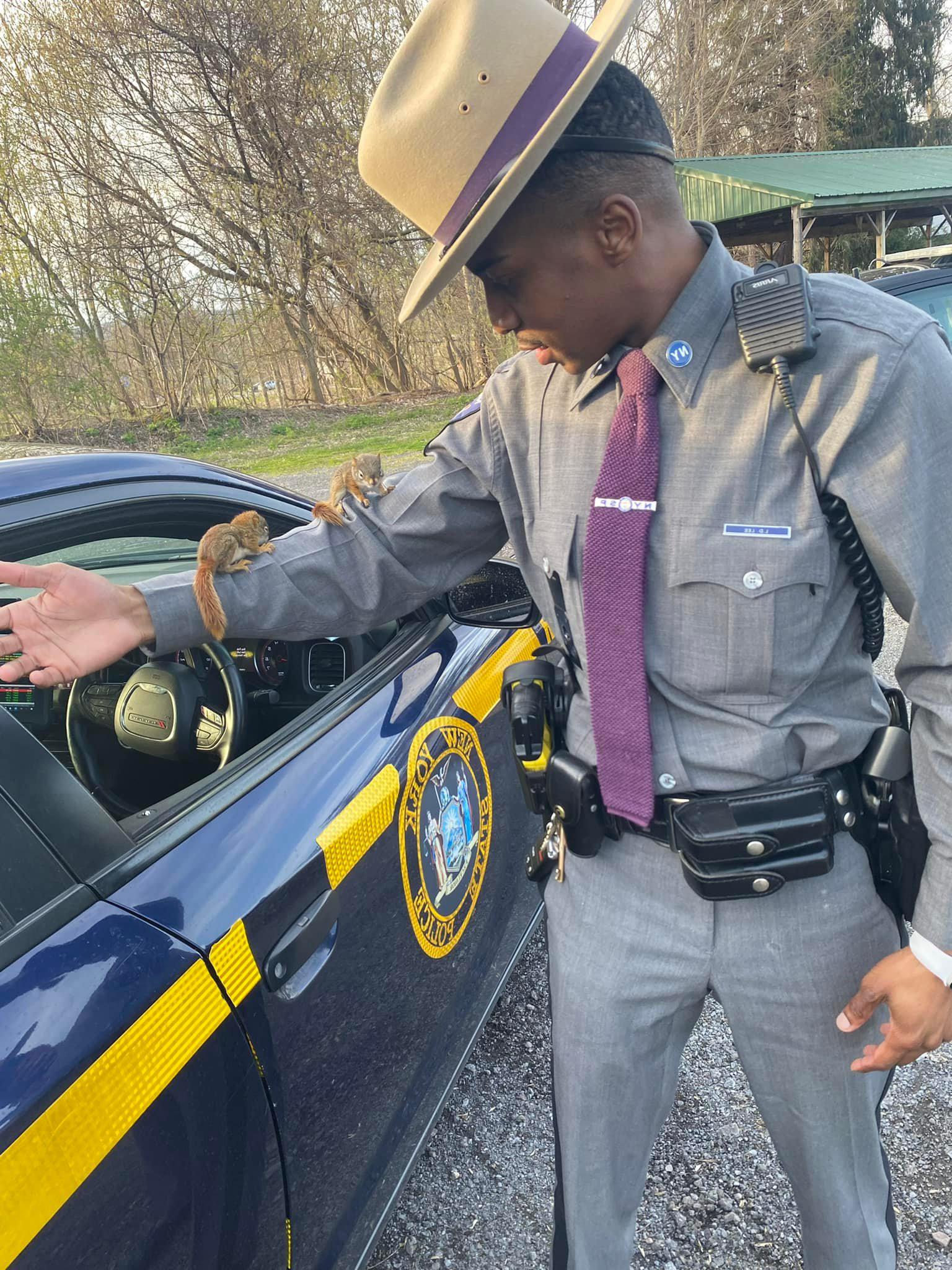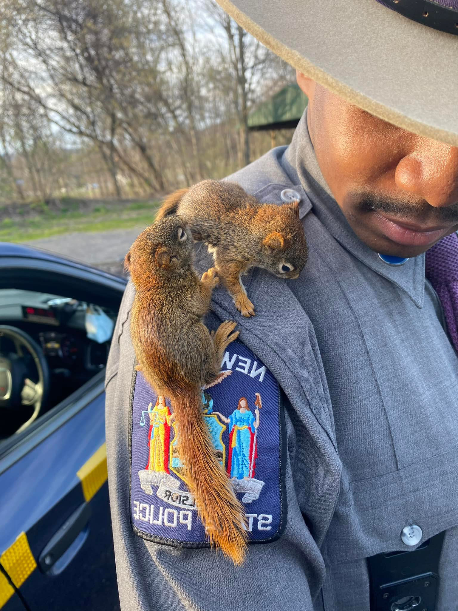 2022年05月05日日前美國紐約伊薩卡市(Ithaca)的一條繁忙馬路上出現了驚險的一幕。只見2隻小松鼠待在馬路中央,被來往的車輛嚇得手足無措,不知道該何去何從。正在巡邏的警員LaVonte’ Lee發現了牠們,連忙下車將松鼠們帶到路邊,松鼠們接下來的表現超有愛~