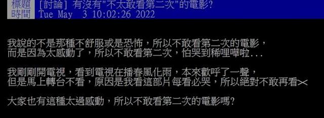 2022年05月05日不少人閒暇時候會看電影打發時間。日前一名網友在PTT電影板詢問:「有沒有不太敢看第二次的電影?」原po強調,非觀賞過程不舒服或是恐怖,所以不敢看第二次的電影,而是因為電影情節太感動而不敢二刷,擔心會哭到稀哩嘩拉的類型。這一話題迅速引發討論。