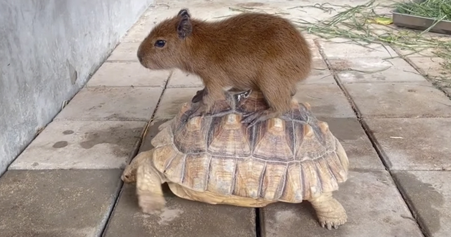 2022年05月10日最近一段有趣的影片在TikTok上熱傳。從影片中可以看到,一隻小水豚穩穩站在蘇卡達象龜的龜殼上。龜龜緩緩前進,小水豚則很有耐心,堅持待在上面不下來。最後龜龜載著小水豚來到放滿青草的飼料區,小水豚這才開心跳下來,結束這趟旅程~