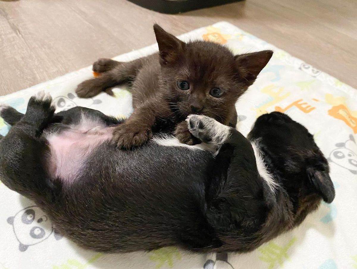 黑色小奶喵第一次見到「同色系小奶狗」 轉頭滿臉困惑:牠是貓咪嗎?