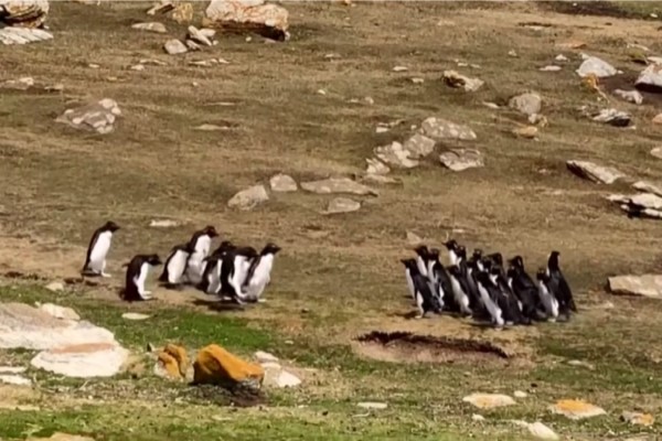 ▼這兩隊企鵝在陸地上相遇,一隊剛剛從海上覓食回來,另一隊則正準備去大海找食物。牠們遇到後停下來攀談了一會兒,然後就各自走開,沒想到其中一隻企鵝竟然跟錯隊伍,跟著另一隊企鵝走回頭路。