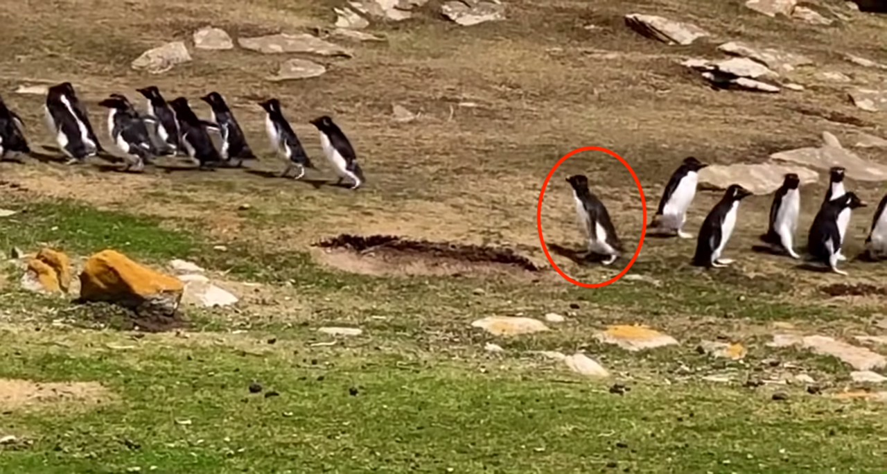 2024年02月04日傻呼呼的小動物很可愛!最近國外一名網友分享了一段企鵝影片。影片中的2群跳岩企鵝在野外相遇,牠們互相寒暄後準備分開,沒想到其中一隻呆萌的企鵝竟然跟錯隊伍,走向了另一個方向。同伴們著急地回來喊牠:「你不要亂跑,快跟上來!」
