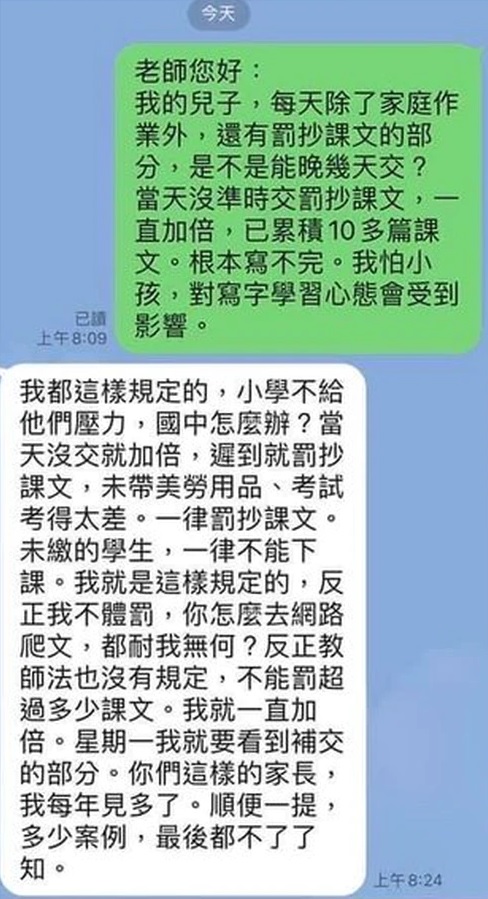 ▼老師看到後竟回說:「我都這樣規定的,小學不給他們壓力,國中怎麼辦?當天沒交就加倍,遲到就罰抄課文,未帶美勞用品、考試考得太差一律罰抄課文,未繳的學生一律不能下課,我就是這樣規定的,反正我不體罰,妳怎麼去網路爬文都奈我無何?反正《教師法》也沒規定不能罰超過多少課文,我就要一直加倍!周一我就要看到補交部分,你們這家長我每年見多了,順便一提,多少案例最後都不了了之。」