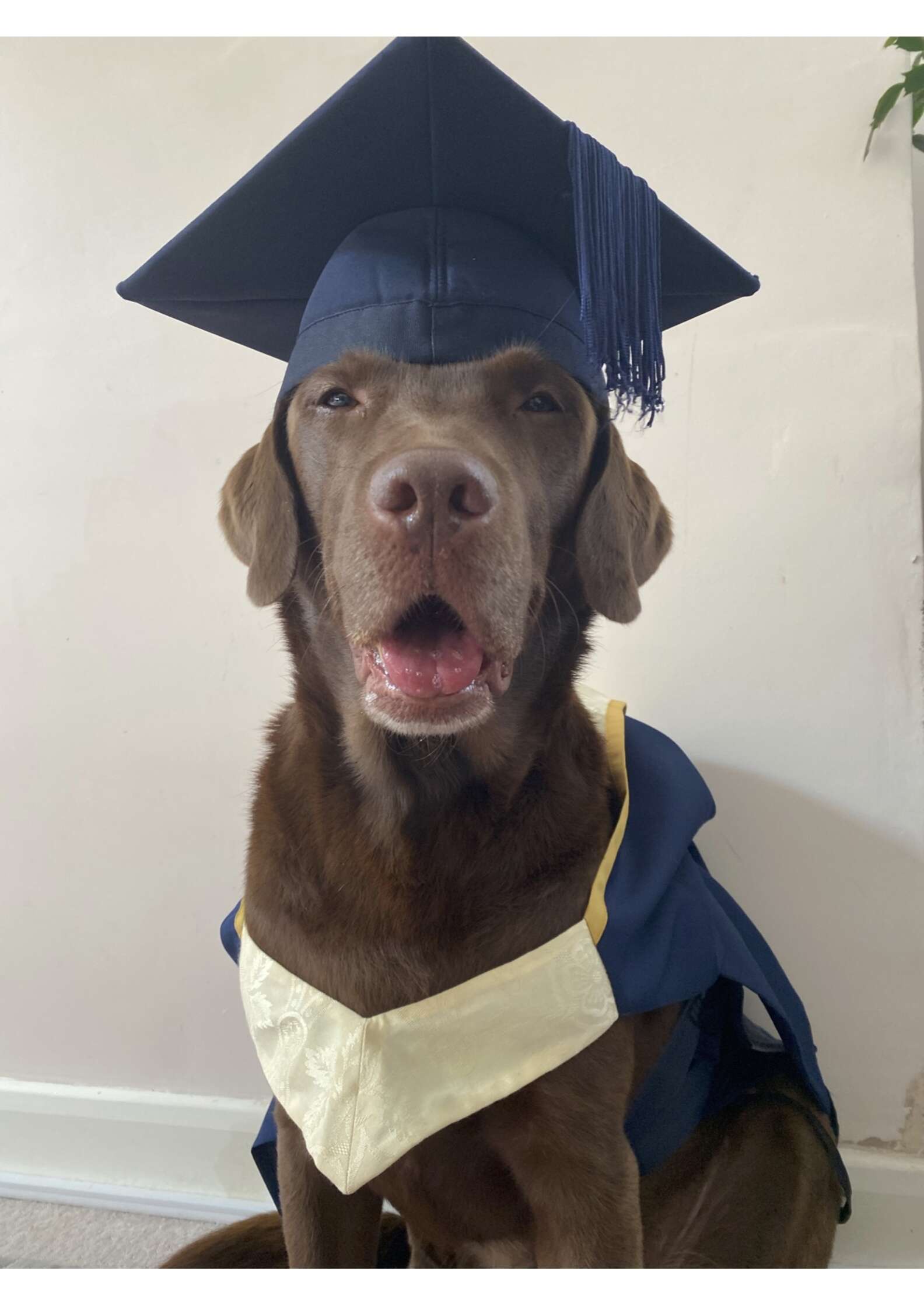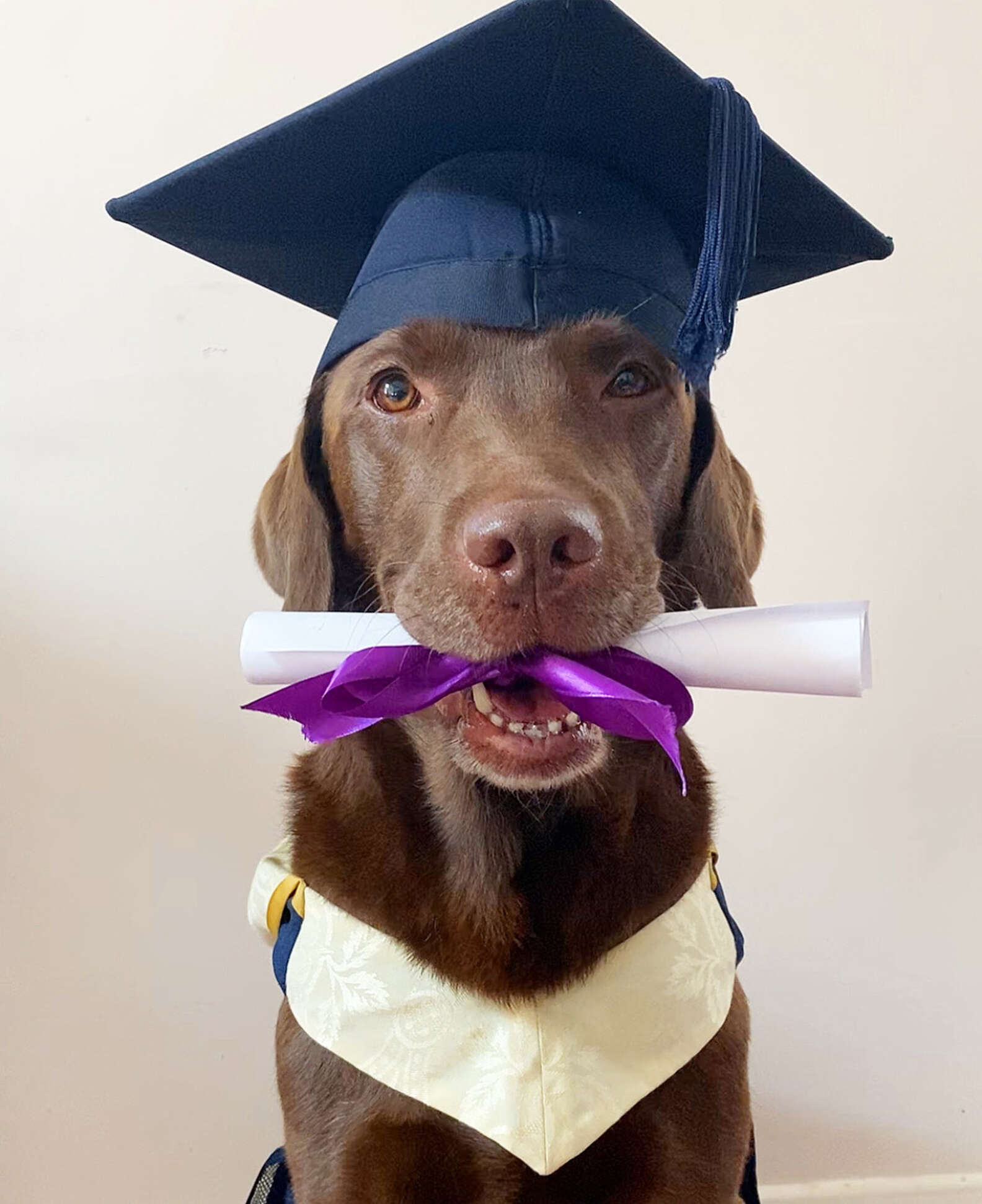 ▼Alex說:「我們一直覺得,牠在做一隻好狗狗方面非常專業,所以牠理應拿到畢業證。Ollie是一隻很喜歡叼東西的狗狗,所以我們讓牠叼著捲軸拍照時,進行得非常順利。Ollie拍的照片很帥氣,牠自己也很滿意。拍好照片後我們將牠的帽子摘下來,但牠不願意把捲軸還回來。」