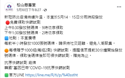2022年05月13日好佛心!近期台灣本土疫情嚴峻,民眾快篩試劑需求量大增。很多民眾湧向藥局排隊購買實名制快篩,但不少人抱怨根本買不到。為此,台北松山慈惠堂決定,將於14、15日各分2梯次向民眾免費發放快篩試劑,預計每梯次開放1000個名額,每人可領2劑。