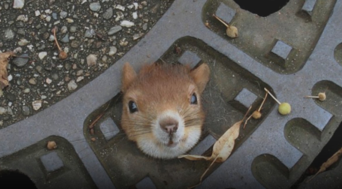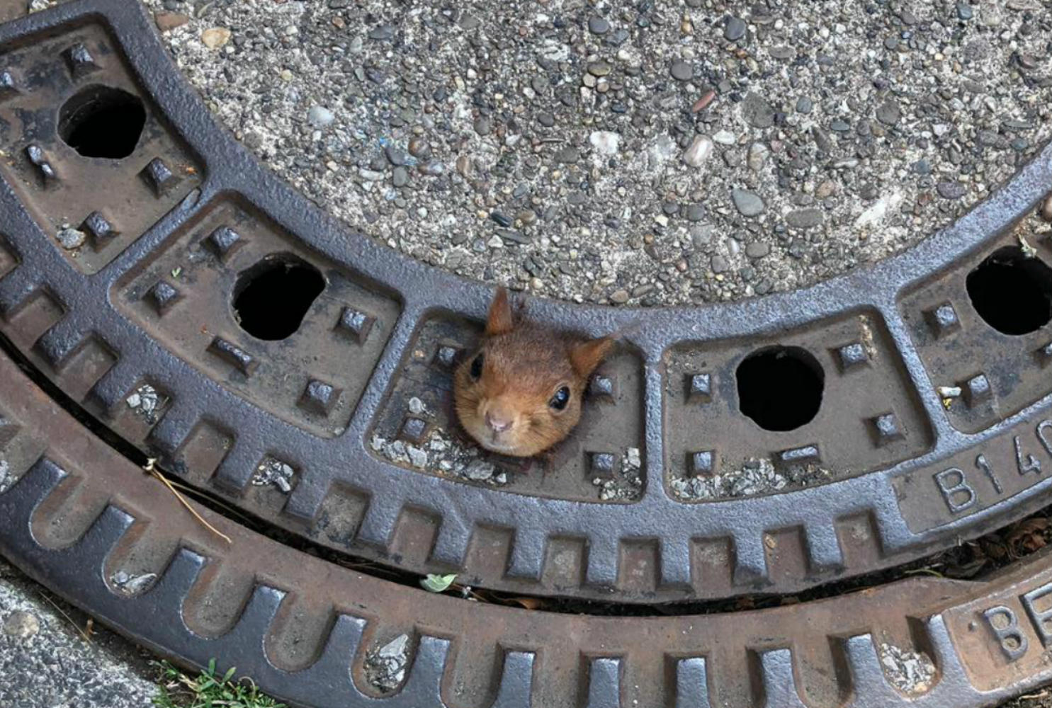 水溝蓋上的這些孔洞,對小松鼠、老鼠等小動物來說其實都非常不友善,一不小心就會卡住。牠們被卡在洞口的樣子惹人憐愛又滑稽,消防人員來救牠們時一定也覺得很好笑吧。