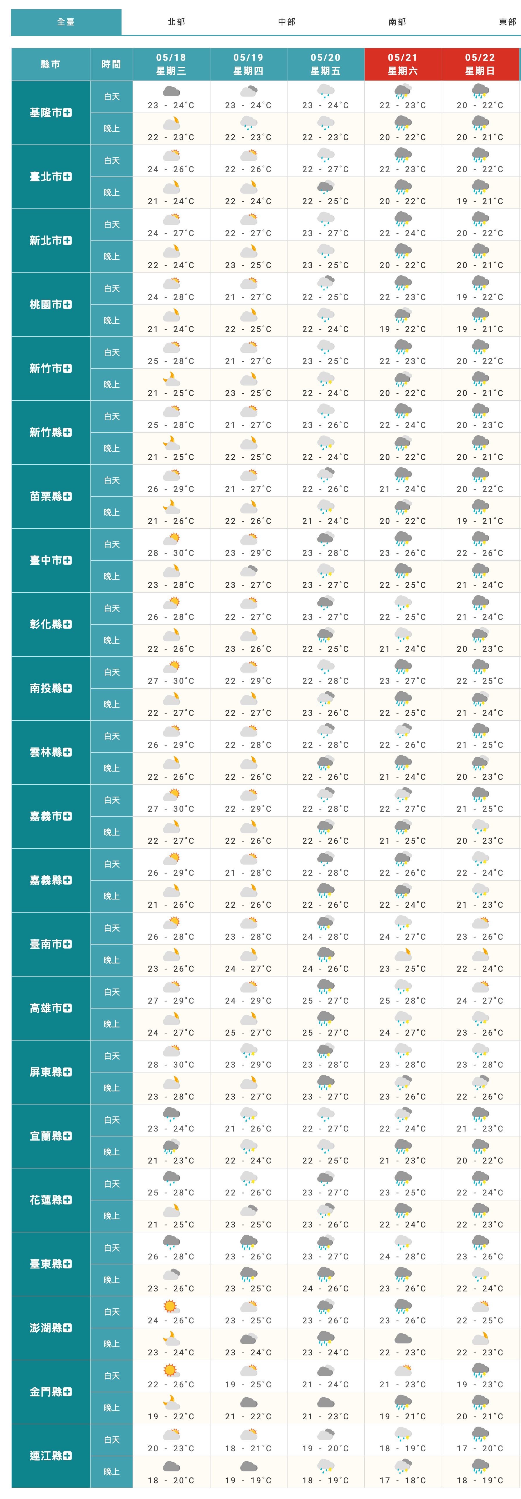 2022年05月18日今天(18日)大氣環境逐漸轉為偏東風,迎風面水氣較多,基隆北海岸、東半部及恆春半島整天不定時有局部短暫陣雨,尤其恆春半島及東南部晚上之後受南方雲系北移影響,降雨有機會轉趨明顯。西半部大多為多雲到晴,午後山區有局部短暫雷陣雨。東北季風持續減弱,各地天氣會比昨天更為溫暖。不過週五開始又會有下波鋒面來襲。