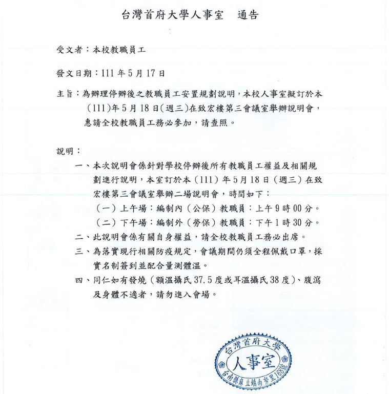 一位台首大資深員工無奈說:「該來的,還是來了!」台首大跟很多私立大學一樣,招生原本就很吃力,這兩年疫情讓外籍生招收幾乎停擺,學校經營陷入困境,不得不斷然止血。早就想到會有這一天,只是沒想到會來得這麼快。