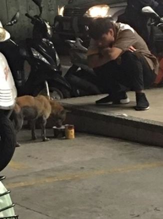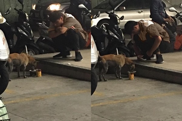 ▼為了避免狗狗被罐頭的邊緣劃到,這位店員還很細心地找了一個碗讓牠吃飯。而且為了確認狗狗有填飽肚子,還在原地抱胸蹲下,靜靜地陪伴狗狗!