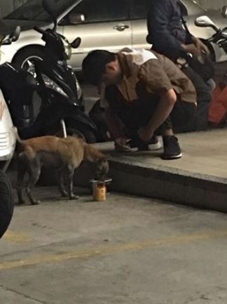 雖然因為天況昏暗,沒有辦法完全看清這位店員的表情,但他的溫情表露無遺,有愛心的男人最帥氣啊!