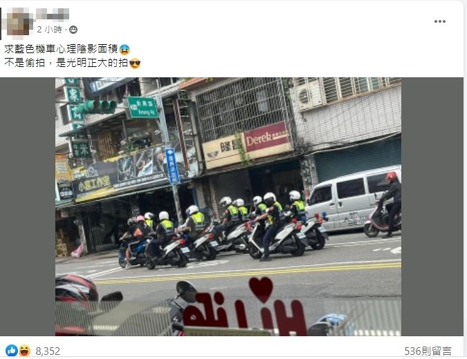 ▼原po澄清說,這張照片並不是偷拍的,而是光明正大拍攝的。那天下午他閒著沒事,在超商休息時看到了這有趣的景象。他將照片po上網,並說:「求藍色機車心理陰影面積。」