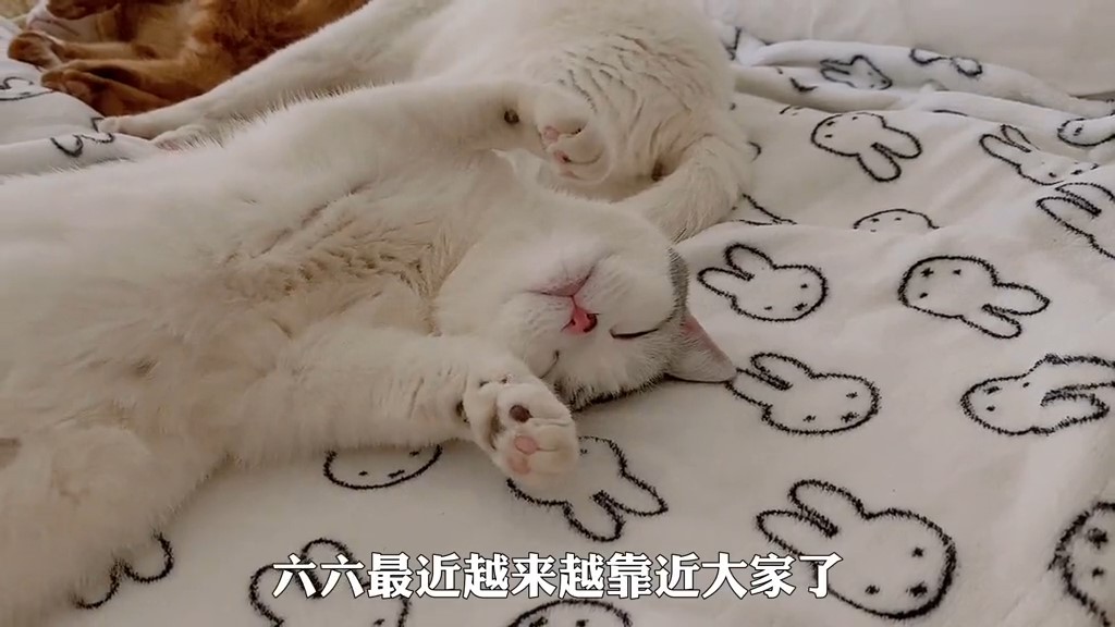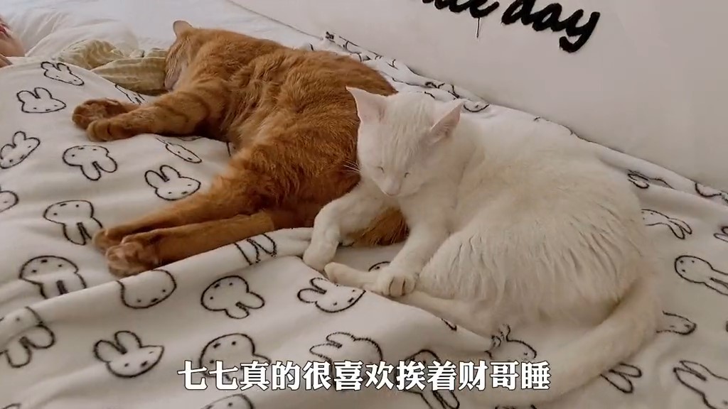▼在旁邊互相理毛的橘貓「財哥」和白貓「七七」看到這一幕,也跑過來加入陪睡的行列。因為福妹和財哥佔據了妹妹的手臂,七七只好選擇挨著財哥睡下。