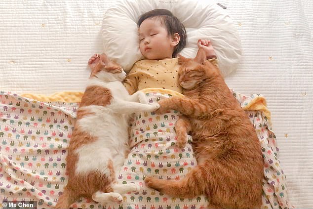 ▼陳小姐經常在網路上分享毛孩們和小孩的甜蜜互動,5隻貓咪陪妹妹睡覺的影片也引發關注: