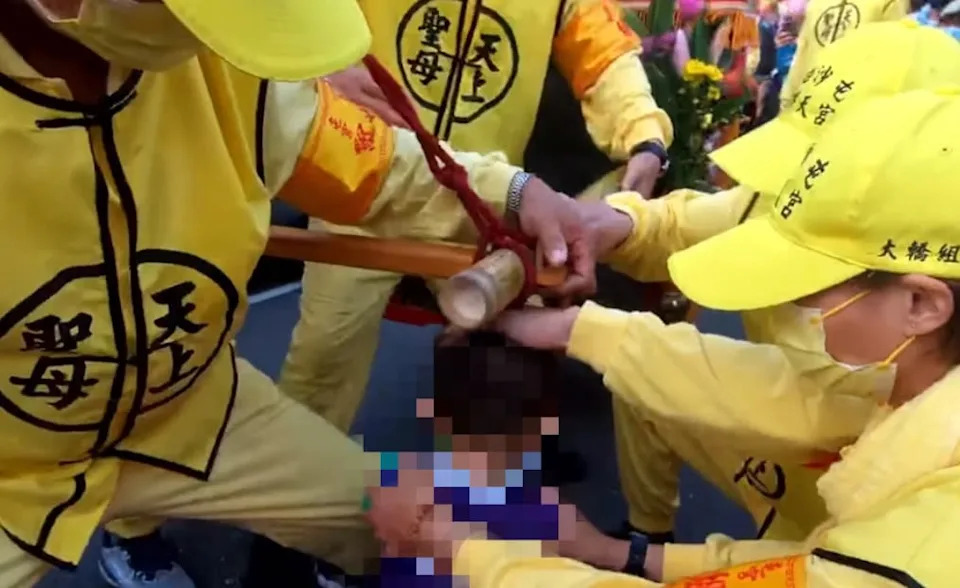 ▼媽祖鑾轎將轎槓放在男童頭頂,就像媽祖在慈愛地撫摸孩子的頭,這溫馨的一幕非常感人。媽祖鑾轎接著往後停住,母子兩人就跪在路邊,整個過程約5分鐘後,鑾轎隊伍再往前行進。