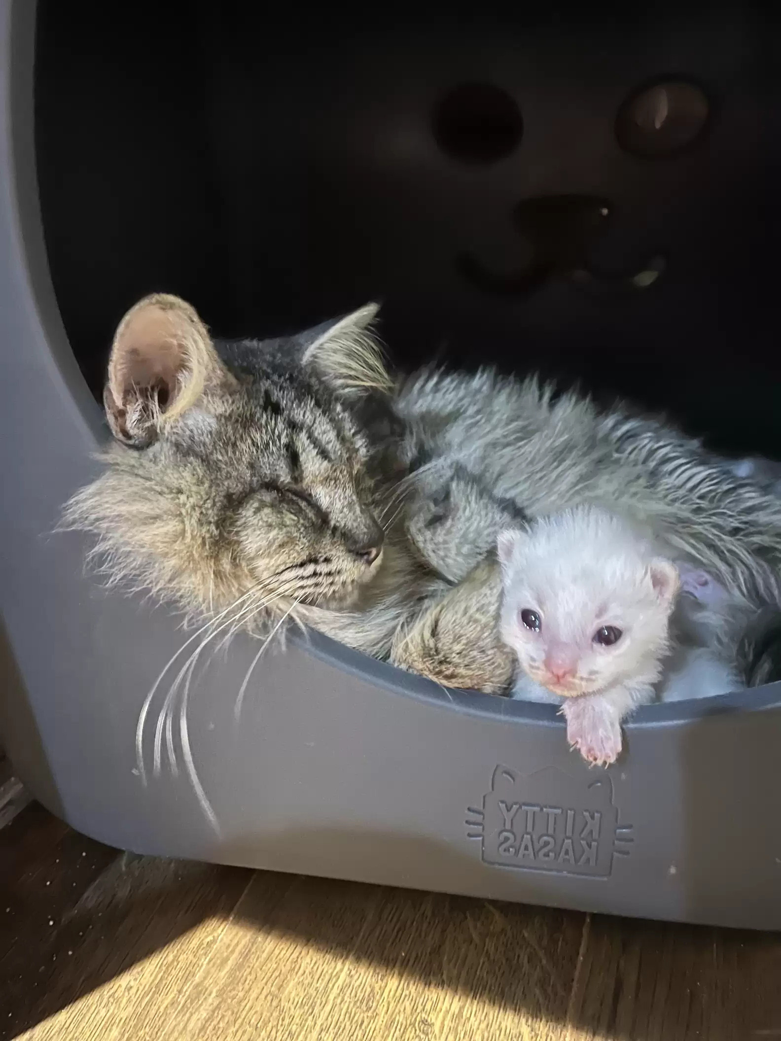 2022年05月27日日前美國德州的一位網友去探望父母時,在住家附近遇到了一隻無法睜開眼睛的浪貓Clue。他跟著Clue來到牠睡覺的地方,竟在那個簡陋的小窩裡看到了3隻幼貓!原來這隻聰明的貓媽媽知道自己無法照顧小貓,所以主動向人類求助~