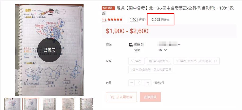 ▼這名北一女學生在蝦皮販售筆記,以「北一女國中會考筆記」斗大字樣為標題,並強調是全麥克筆記、108年新改版,1份全科筆記要價2600元。從商品介紹圖可以看到,筆記條列式結構分析,而且記錄非常詳細,字體工整美觀,地理科目還畫有精美地圖,並用橘色、黃色、藍色各種顏色區分劃出重點,一眼就能看清楚考點。