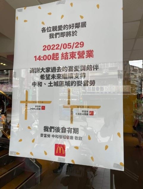麥當勞中和連城分店默默貼出公告,宣布結束營業。對此,有網友在PTT發文說,不知道公告多久了,先前都沒有聽到閉店的消息,導致他知道時已經結束營業。原po回憶說,這間店原本有3層樓,幾年前封起來只留下廁所,但封起來的地方似乎不是當成倉庫,都是空空的。