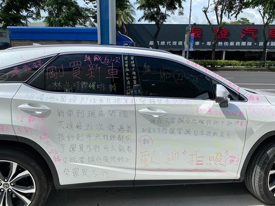 2022年06月01日一位車主花200萬元買新車,沒想到短短幾個月就在路上熄火5次,送回原廠修理也修不好。他氣憤拿螢光筆在車體上寫滿罪狀,包括「林北這台車會熄火,公司修不好」、「還我錢」、「歡迎拍照,給世界看到」等等。這畫面被po到網路上後引發討論。
