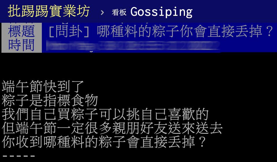 ▼原po表示:「端午節快到了,粽子是指標食物,我們自己買粽子可以挑自己喜歡的,但端午節一定很多親朋好友送來送去,你收到哪種料的粽子會直接丟掉?」