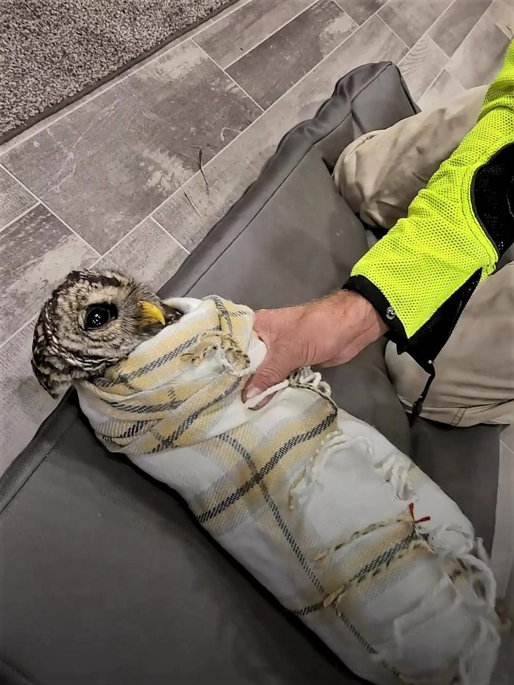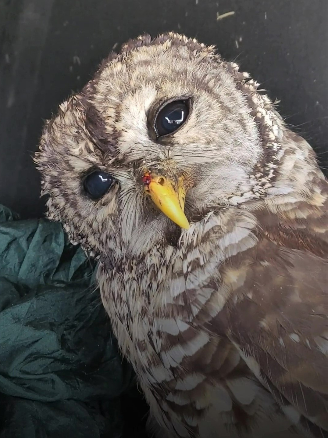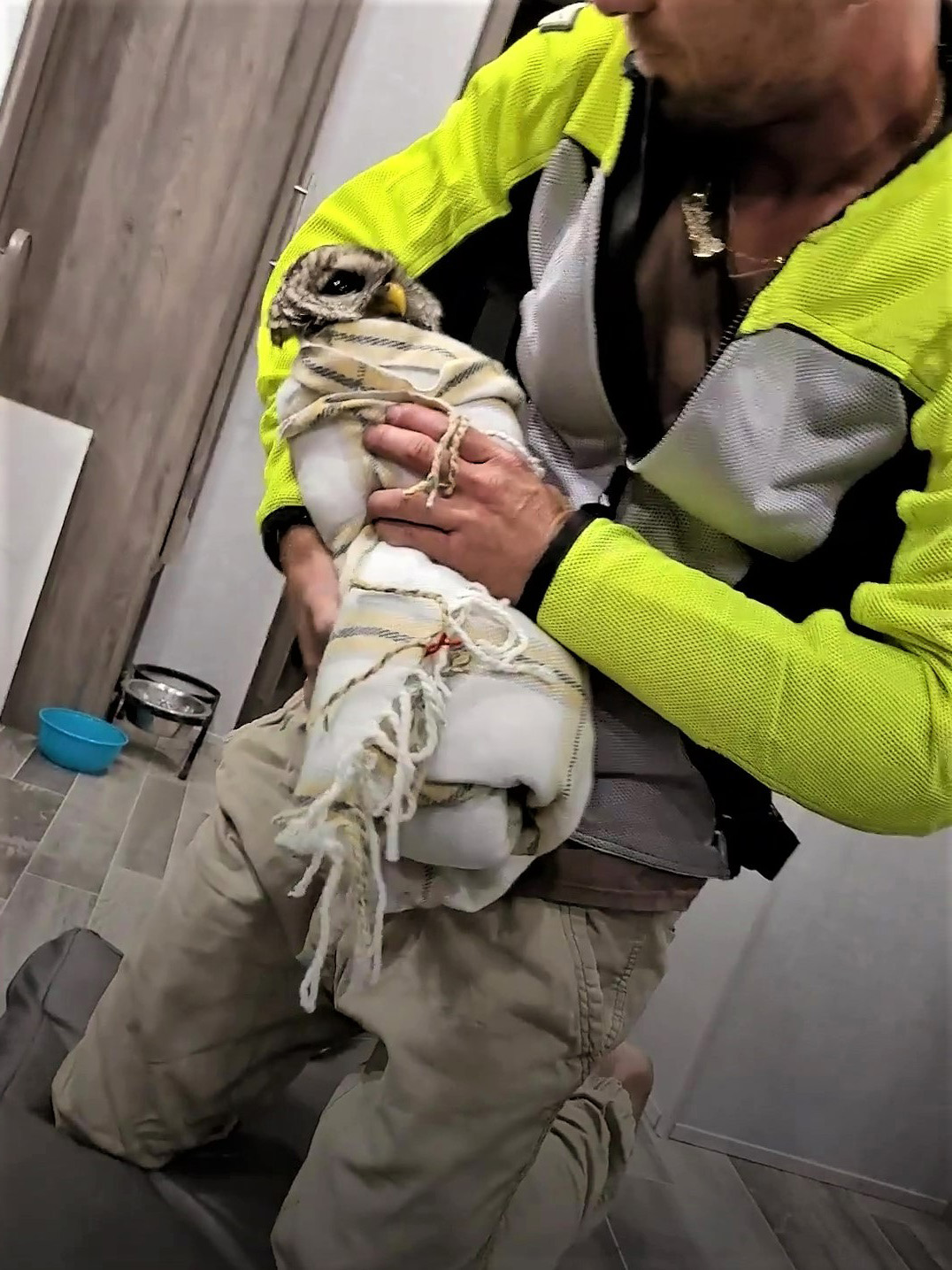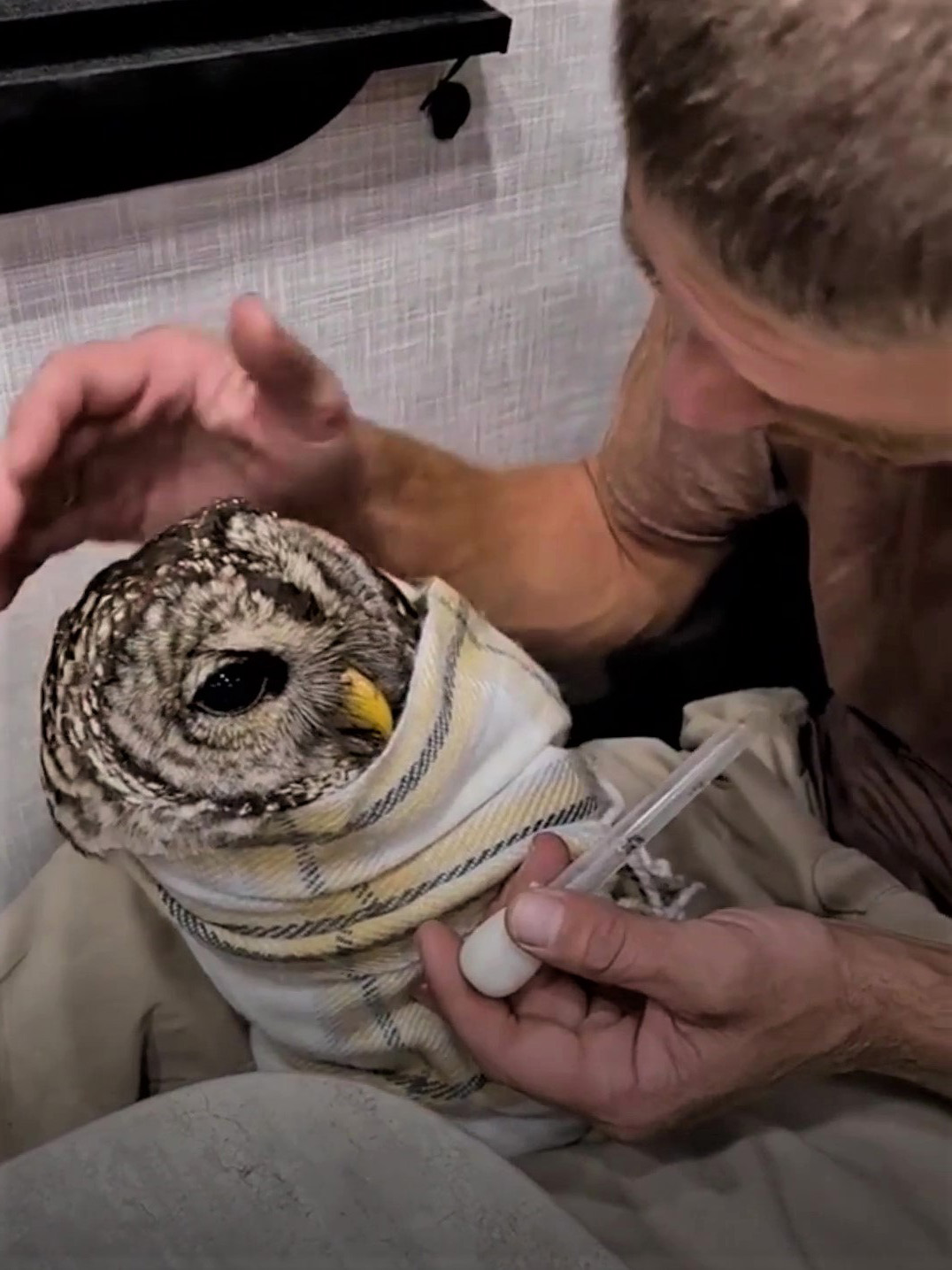 貓頭鷹受傷動彈不得! 牠乖乖被包成「壽司卷」:要帶偶肥家嗎~