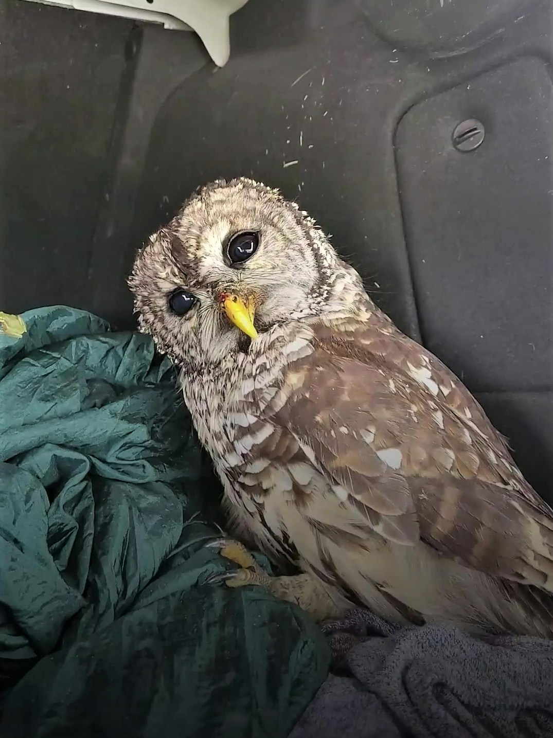▼夫妻兩人看到KoKo的鳥喙上有血跡,猜測牠可能是受傷了,因為附近沒有相關的動保救援單位,所以他們決定先將貓頭鷹帶回家救治。KoKo被抱上車時非常平靜,還微微歪頭看向兩人,那乖巧呆萌的模樣超可愛。