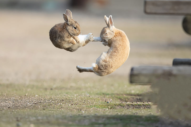 ▼從照片中可以看到,這2隻兔兔騰空而起,其中一隻踢腿發動攻擊,另一隻則後退防禦。攝影師捕捉到這珍貴的瞬間,把牠們勢均力敵的對抗拍攝了下來,一眼看去就像電影中的武打戲,充滿力量和美感