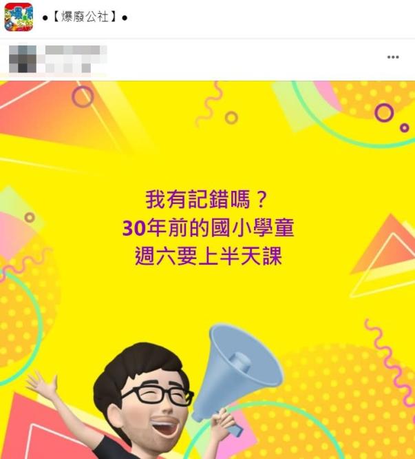 一名網友在臉書社團「爆廢公社」發文問:「我有記錯嗎?30年前的國小學童,週六要上半天課?」網友們紛紛留言說:「不只國小,國中、高中那時也要上課」、「一開始一到六,後來隔週休,再後來就週週休」、「隔週休1998實施,才24年前而已」。