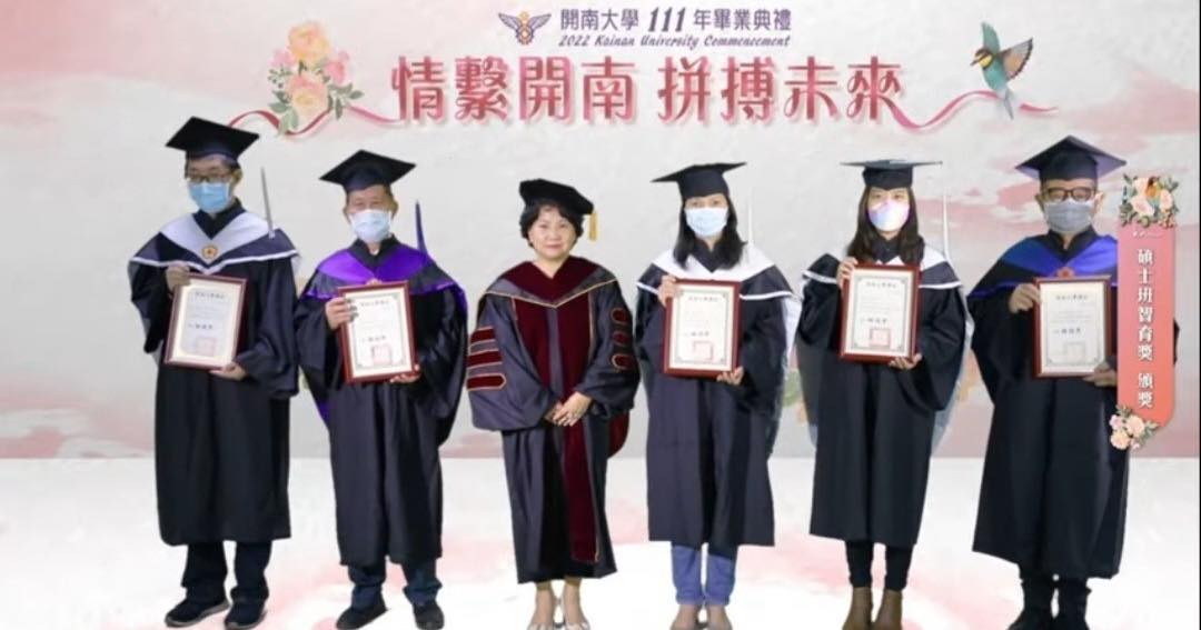 ▼因為疫情嚴峻,開南大學的畢業典禮改採線上模式,現場並沒有觀眾,不過許效舜仍是最亮眼的畢業生。他就讀健康照護管理學院的健康照護技術碩士班,以第1名的優異成績畢業,並獲得智育獎。許效舜從校長手中接過畢業證書,並與同學開心合影留念。