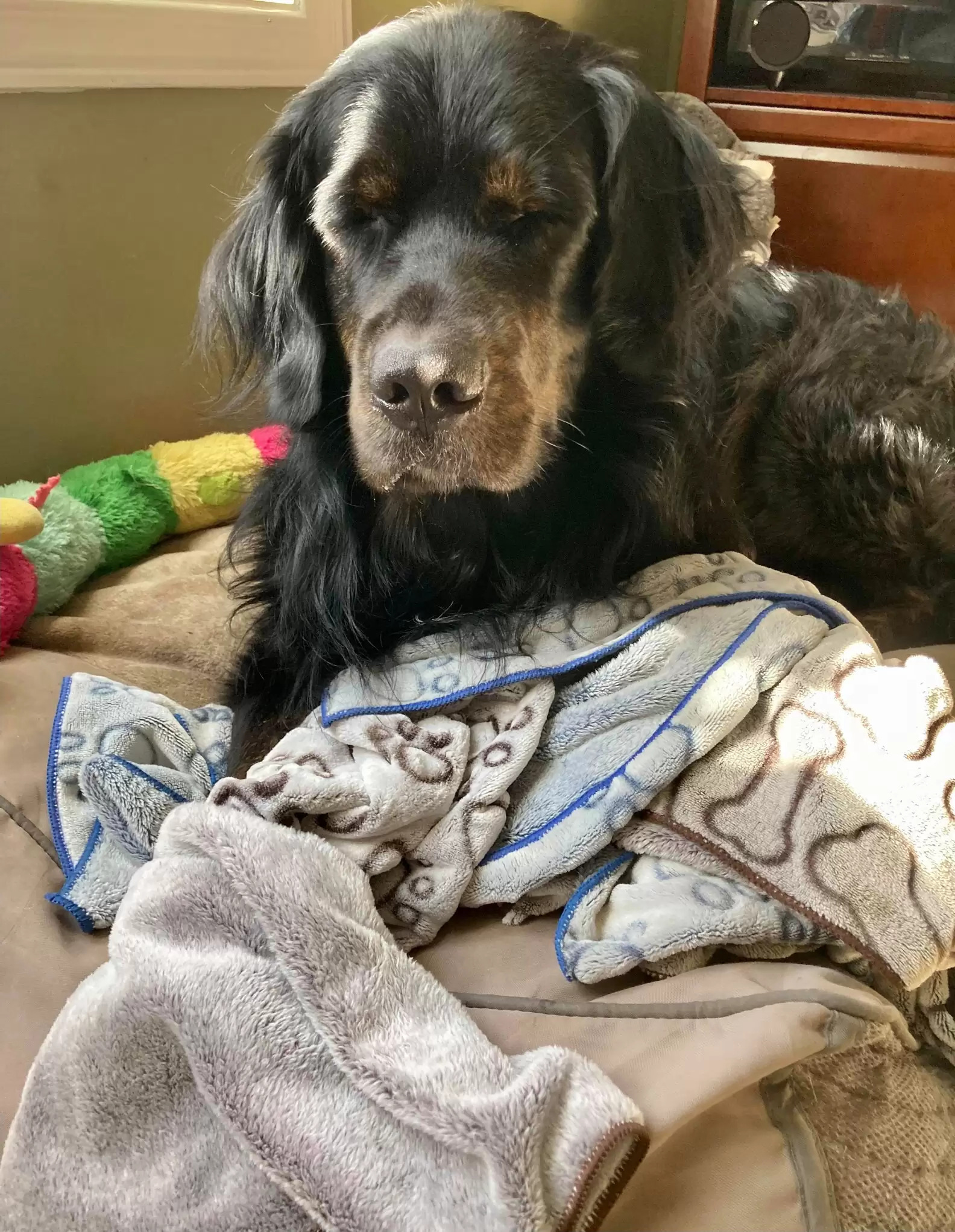 ▼Shauna說:「如果我們不許牠帶著毛毯出門,牠就會表達不滿,還會把所有的小毛毯都疊成一堆。」