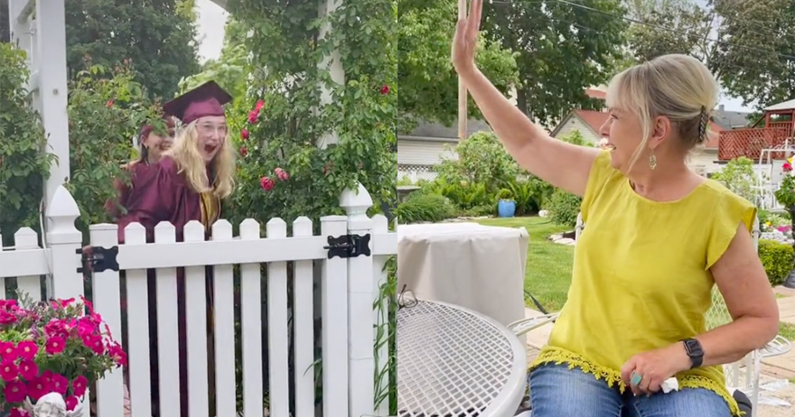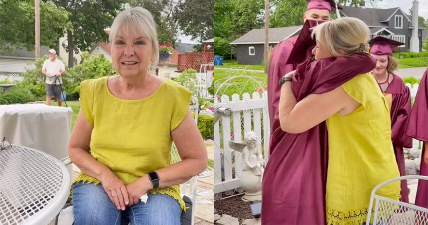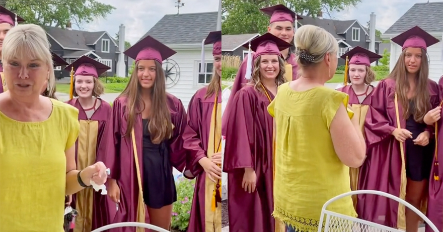 ▼從影片中可以看到,一名老婦人正坐在院子裡休息,她叫Pearson,年輕時是一位幼兒園老師,現在已經退休了。Pearson看到一名身穿畢業長袍、頭戴方形帽的女孩出現在自家門口,她友善地揮揮手跟對方打招呼,笑著說:「恭喜妳!」