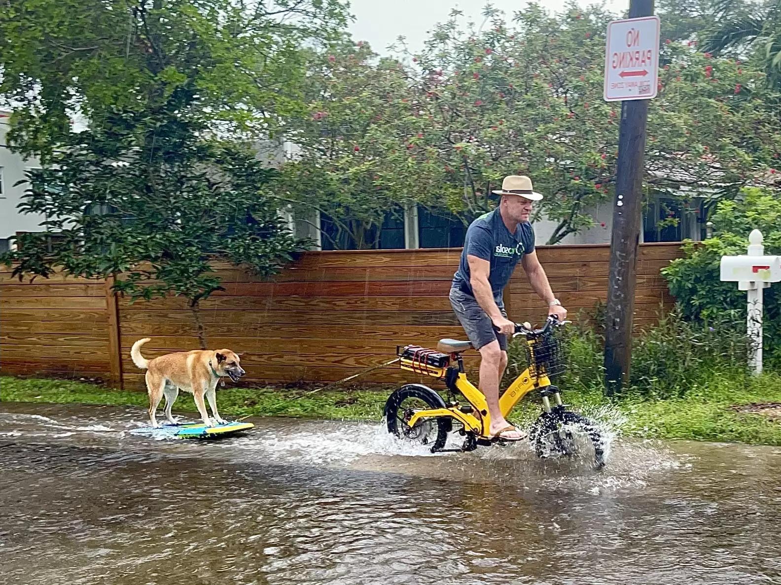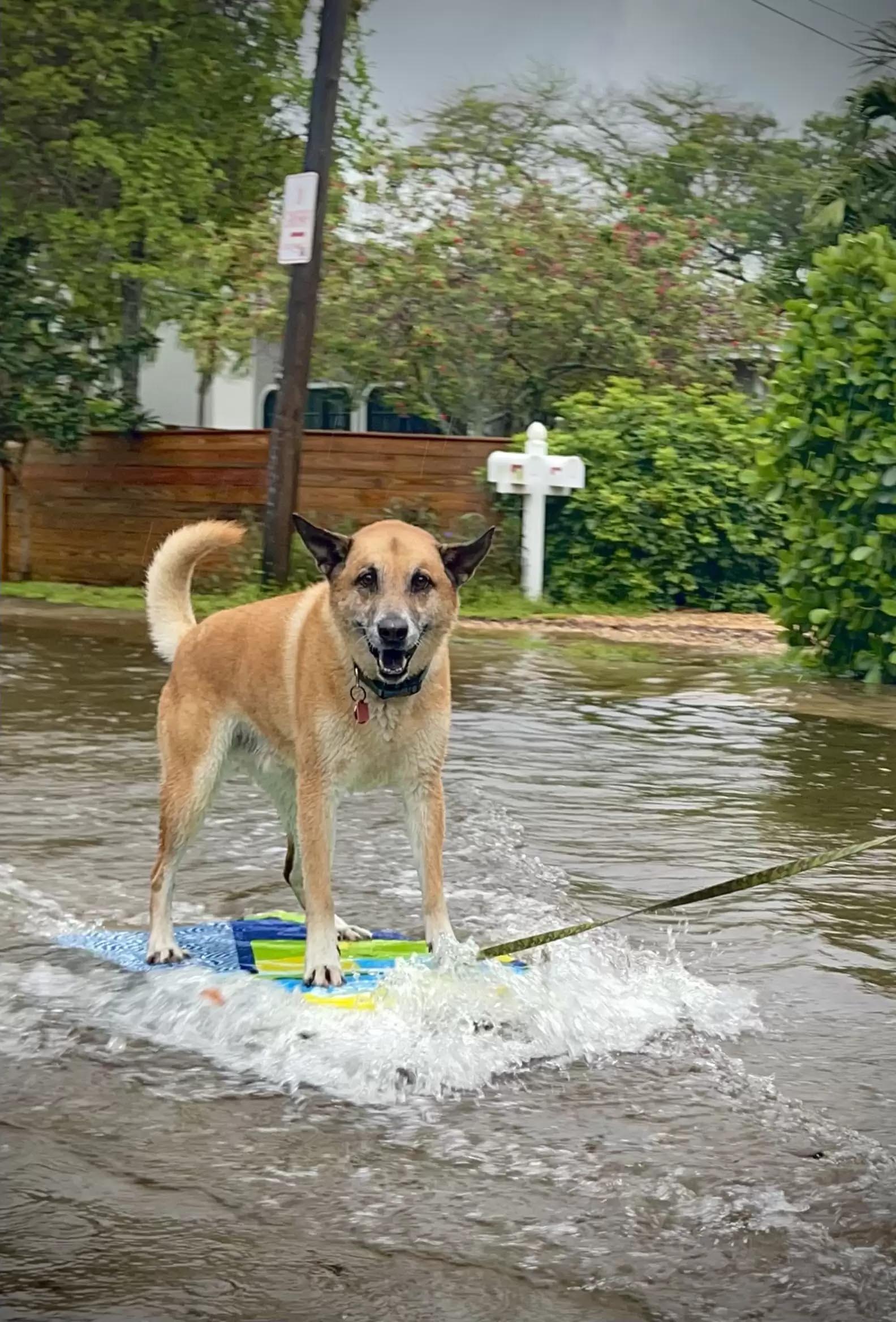 2022年06月22日美國佛羅里達州勞德代爾堡(Fort Lauderdale)擁有綿密的運河系統,因此每次下大雨或颶風來襲,當地都可能淹水。最近勞德代爾堡又因為長期下雨,路面積水嚴重,當地一名飼主Peter Rosen竟帶著愛犬Bo一起到街頭衝浪~