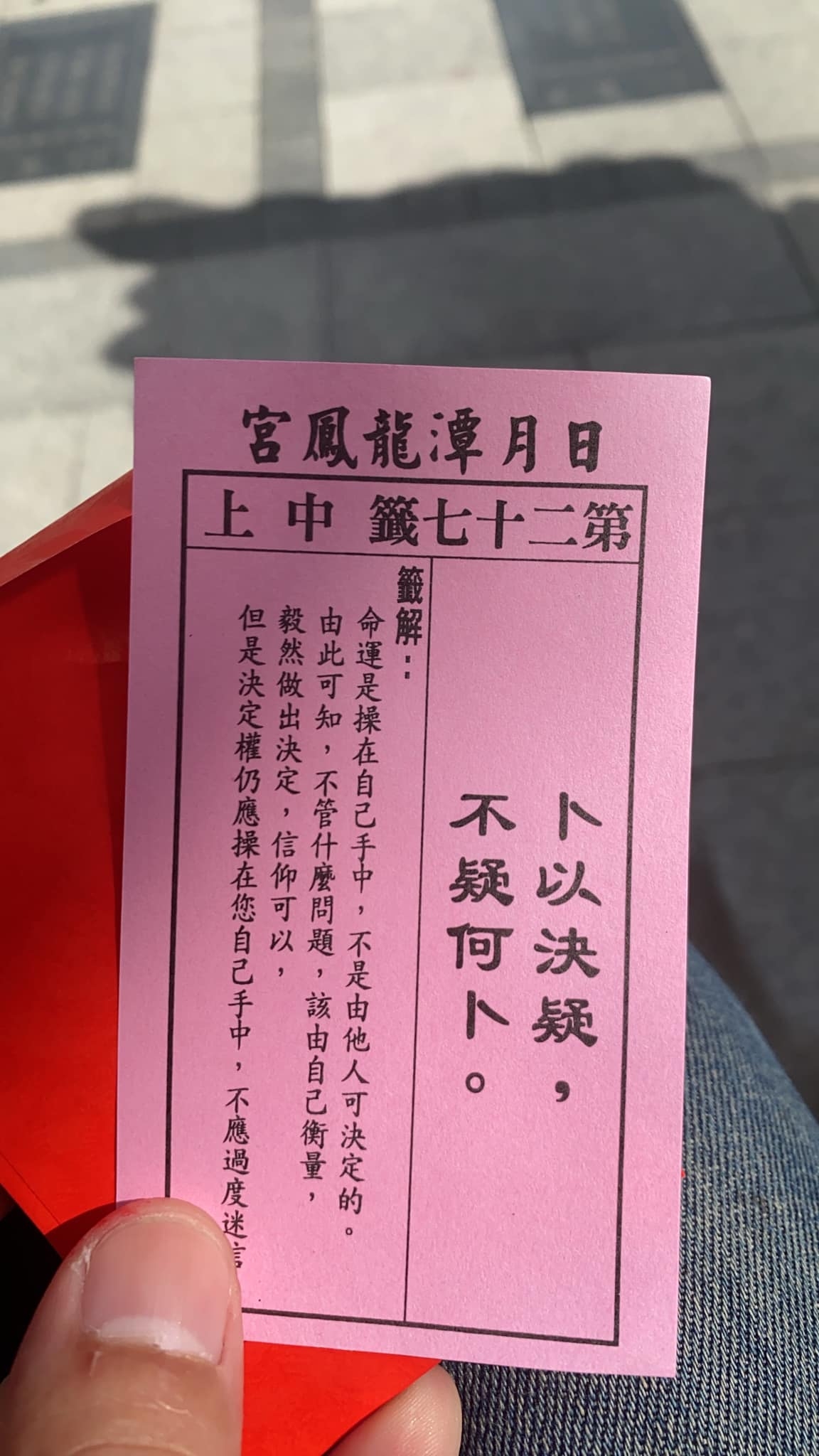 ▼這名男網友在臉書社團「爆廢公社公開版」分享自己的經歷。他到南投日月潭龍鳳宮拜拜抽籤,希望能求得好姻緣,結果抽到的籤詩內容為「卜以決疑,不疑何卜」。籤解是「命運是操在自己手中,不是由他人可決定的,由此可知,不管什麼問題,該由自己衡量,毅然做出決定,信仰可以,但是決定權仍應操在您自己手中,不應過度迷信」。