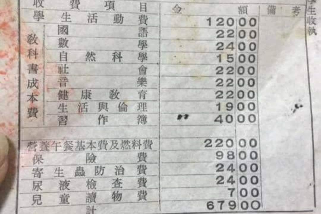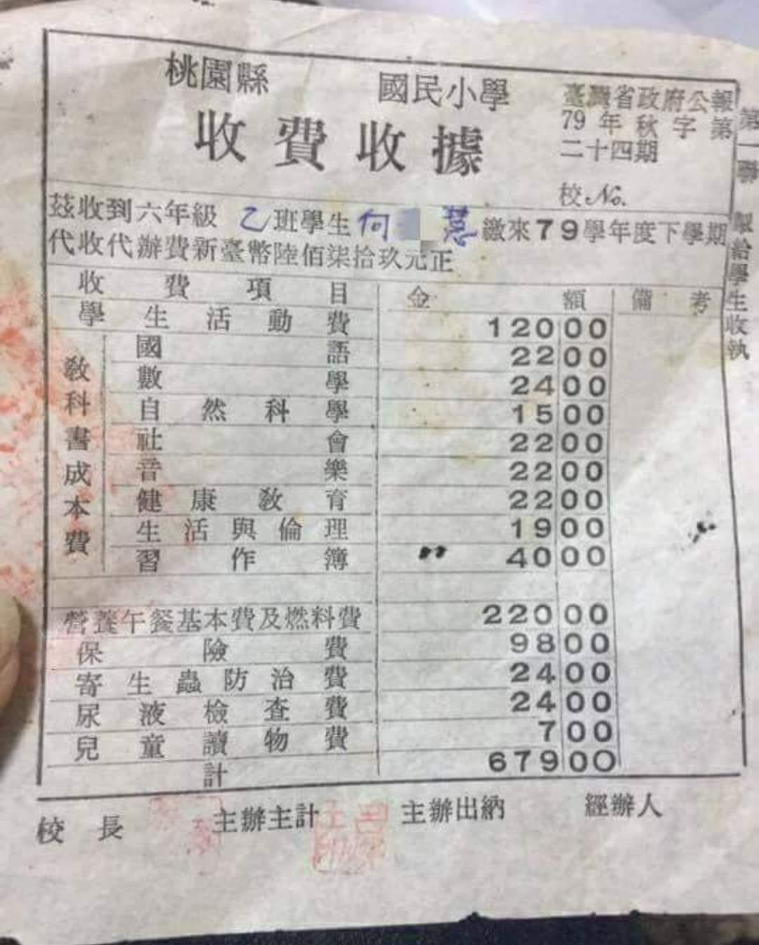 2023年07月11日日前一名網友曬出一張民國79年的小學學雜費收據,內容細項包含學生活動費、教科書費、餐費等等,全部加起來竟然不到700元。她忍不住大嘆「回不去了」。網友們看到後也紛紛留言感嘆,現在的物價跟以前相比漲很多。