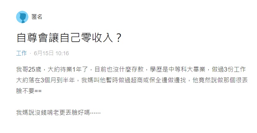 原po在Dcard上發文問:「自尊會讓自己零收入?」原po表示,他哥哥今年25歲,大約待業1年,目前也沒什麼存款。哥哥是中等科大畢業,「做過3份工作,(任職時間)大約落在3個月到半年」,目前則是0收入。
