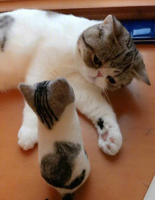 ▼因為是用貓咪的毛做的貓毛氈,所以顏色、氣味都跟本尊非常像。貓咪並不會排斥這個玩偶,只是一頭霧水,那傻楞的模樣超級可愛。