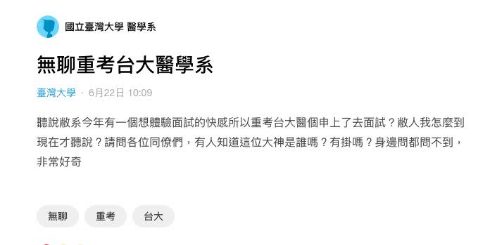 ▼一名台大醫學生22日在Dcard上以「無聊重考台大醫學系」為題發文說,「聽說我們系今年出現一個想體驗面試快感,所以重考醫學系還過了面試」。他想知道這件事是不是真的,因為自己身邊的人都沒聽說。