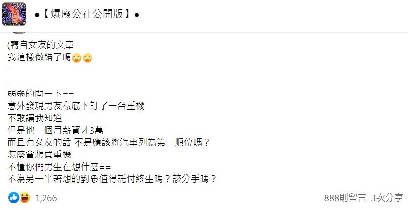 2022年06月29日日前桃園一名男網友在臉書發文說,女友抱怨他月薪3萬卻私自買重機,而沒有買汽車,甚至有了分手的念頭。他大傻眼,忍不住問:「我這樣做錯了嗎?」這件事在網路上引發熱議,很多人無法認同女友的觀點,也有人勸原po做好財務規劃。