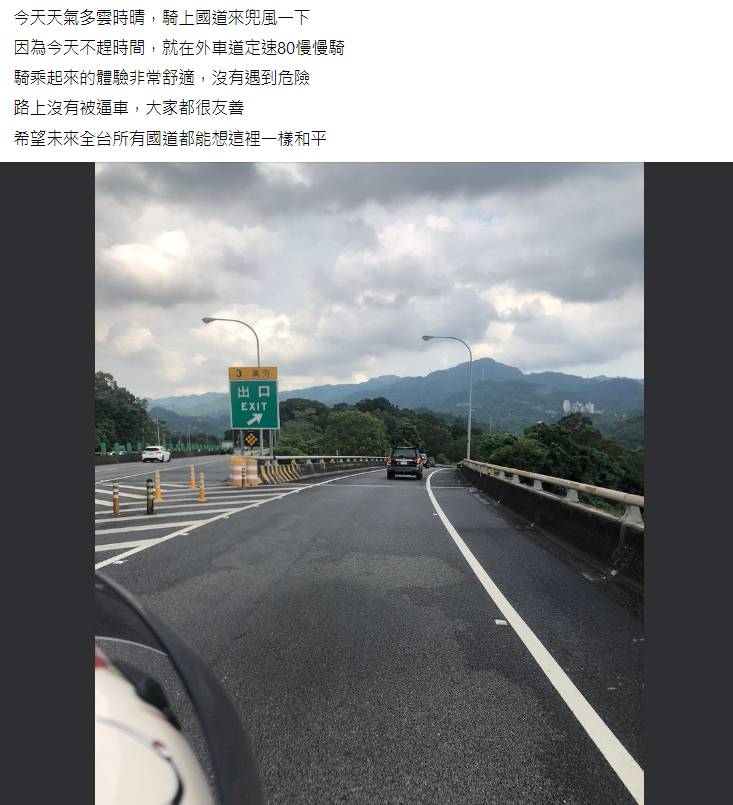 ▼這名網友在臉書社團「爆廢公社」發文,表示因為天氣多雲時晴,氣溫舒適,因此決定騎車上國道來兜風。他強調自己不趕時間,所以從頭到尾都在外車道定速80慢慢騎。原po感嘆說,這趟旅程騎起來感覺非常舒適,也沒遇到危險,路上每個用路人都很友善,「希望未來全台所有國道都能想這裡一樣和平」。