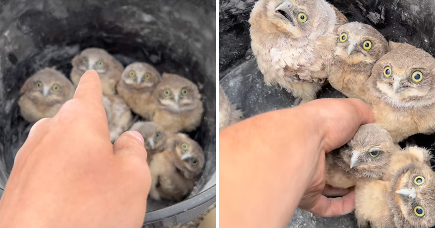 ▼從影片中可以看到,這位動物保護者正準備將穴鴞轉移到人造洞穴裡。他首先「點兵點將」指了一輪,穴鴞寶寶們看到他伸出的手,都嚇得瑟瑟發抖,睜大眼睛觀察他的下一步動作。不過牠們沒有出嘴咬,反而顯得非常乖巧。