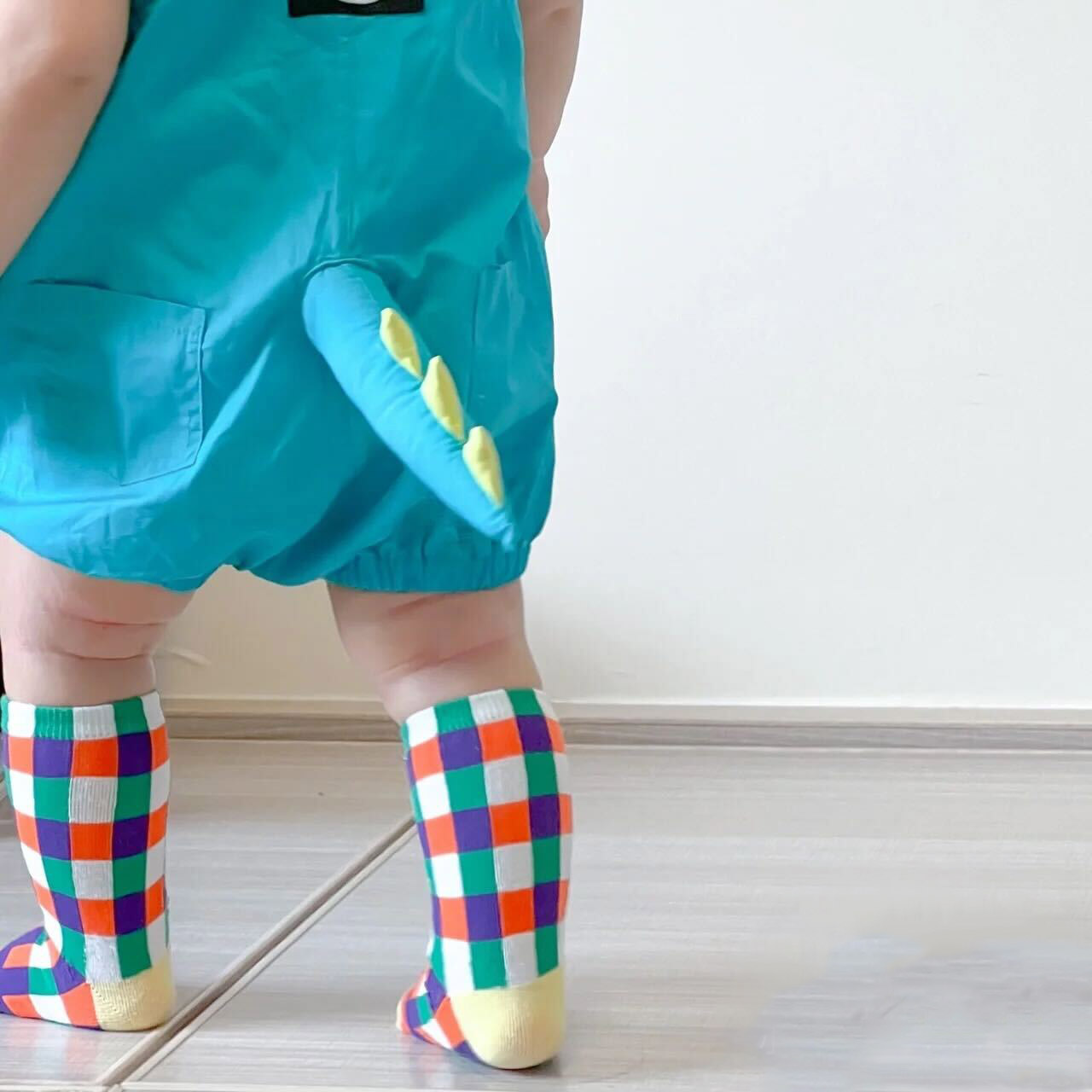 ▼寶寶的衣服越奇特,穿起來越可愛!這件水藍色衣服上有小尾巴,爸媽還給她搭配了繽紛格紋長襪,時尚感非常強。